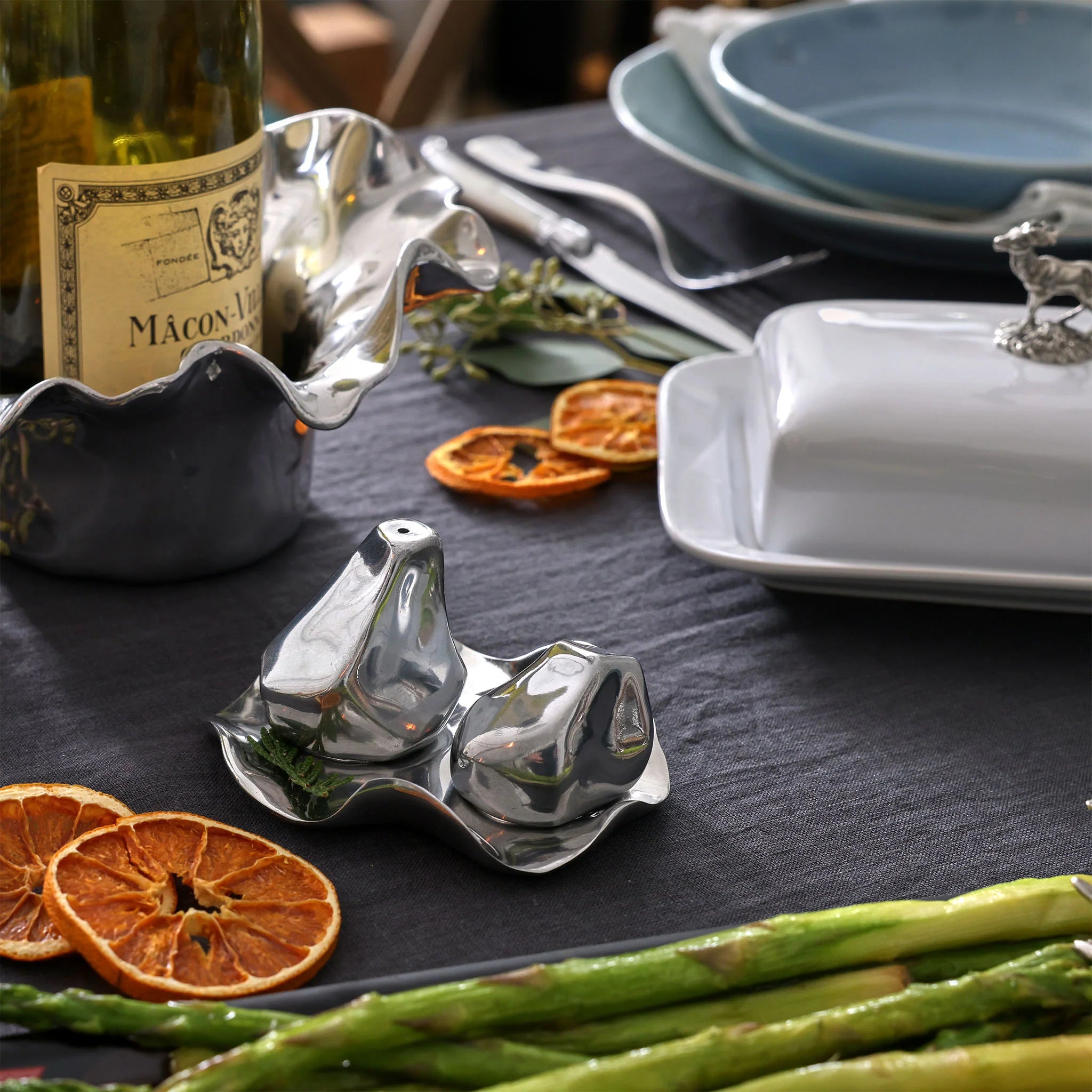 Echoing the look of liquid metal, these uniquely sculpted shakers rest effortlessly atop their wavy-edged aluminum tray, creating a fluid visual moment on your tablescape. The design highlights the signature movement of the Carmel Collection, offering a functional piece doubling as modern sculptural décor.
