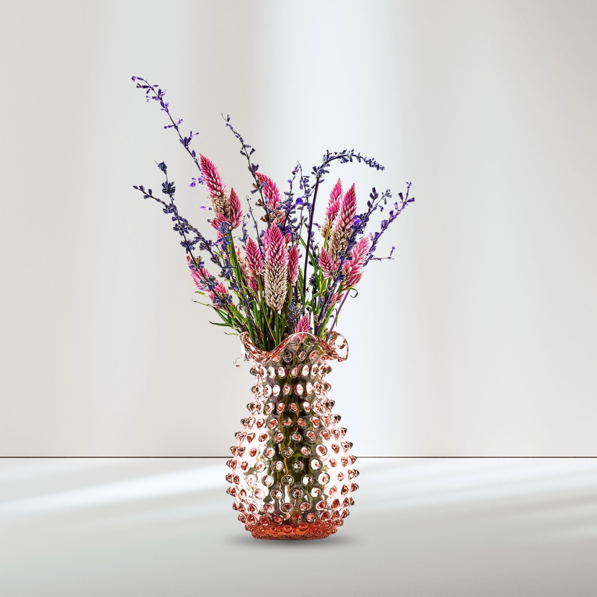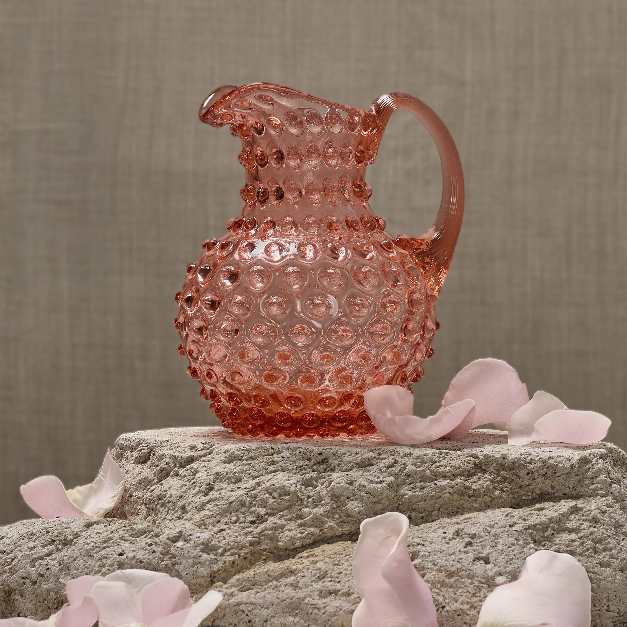 The rose hued 1-liter Hobnail Creamer Jug seamlessly blends beauty and functionality. With its intricate texture and radiant finish, it becomes the perfect pairing for a variety of patterns and colors, adding a masterful touch of creativity to table decor. Serve your favorite beverages or leave as an elegant décor piece, and let this jug reflect the timeless artistry of Maure’s glassware.