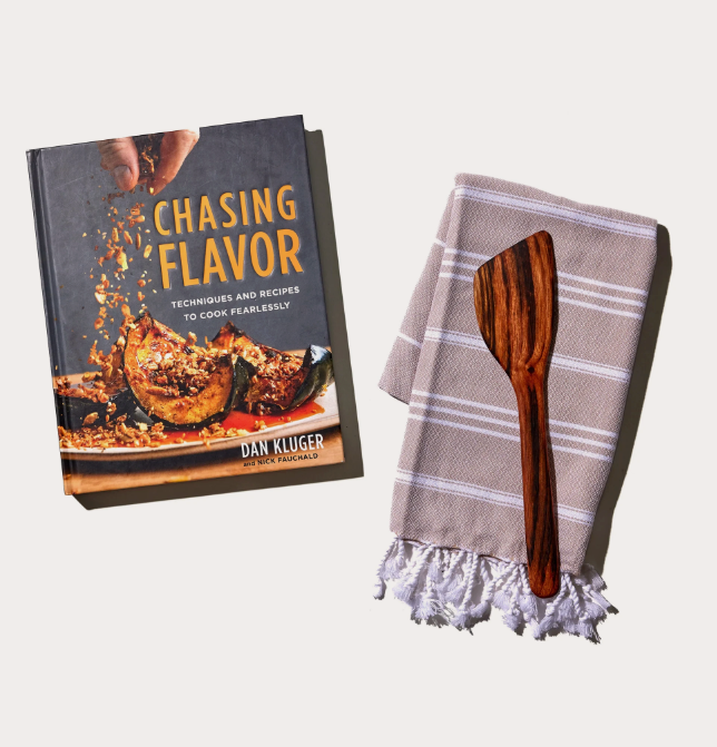 Curated for a luxury housewarming gift basket or for clients, give the gift of exquisite flavor, comfort, and culinary excellence with a signed copy of James Beard Award Winning chef Dan Kluger's cookbook, Chasing Flavor. Accompanied by an exotic wood spatula and a charming striped Turkish towel, this set makes for a straightforward and versatile gift.