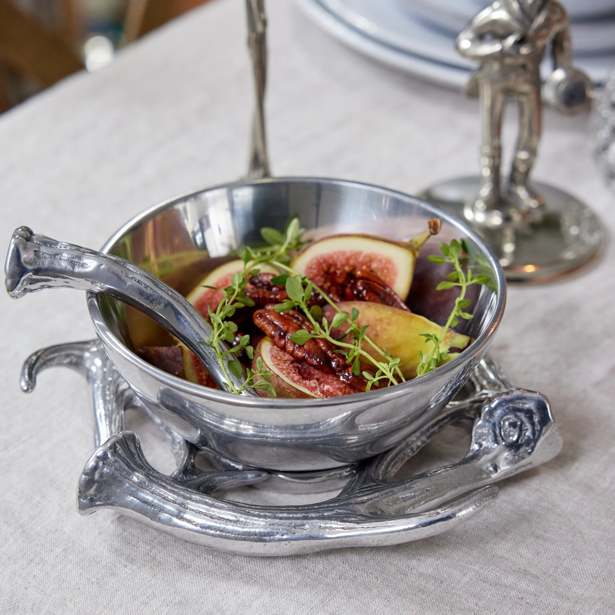 The Antler Condiment Server includes three thoughtfully crafted pieces that create a complete, elevated serving solution. Its base is adorned with intricately woven antlers for a captivating, woodsy aesthetic, while the removable serving dish, a simple yet elegant design, beautifully complements the overall silhouette.