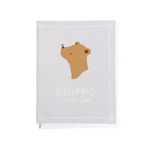 Send a warm bear hug with this hand-drawn greeting card, perfect for celebrating a new arrival. Featuring a sweet bear and buzzing bee illustration, it pairs beautifully with a plush toy, blanket, or hat for a thoughtful gift.