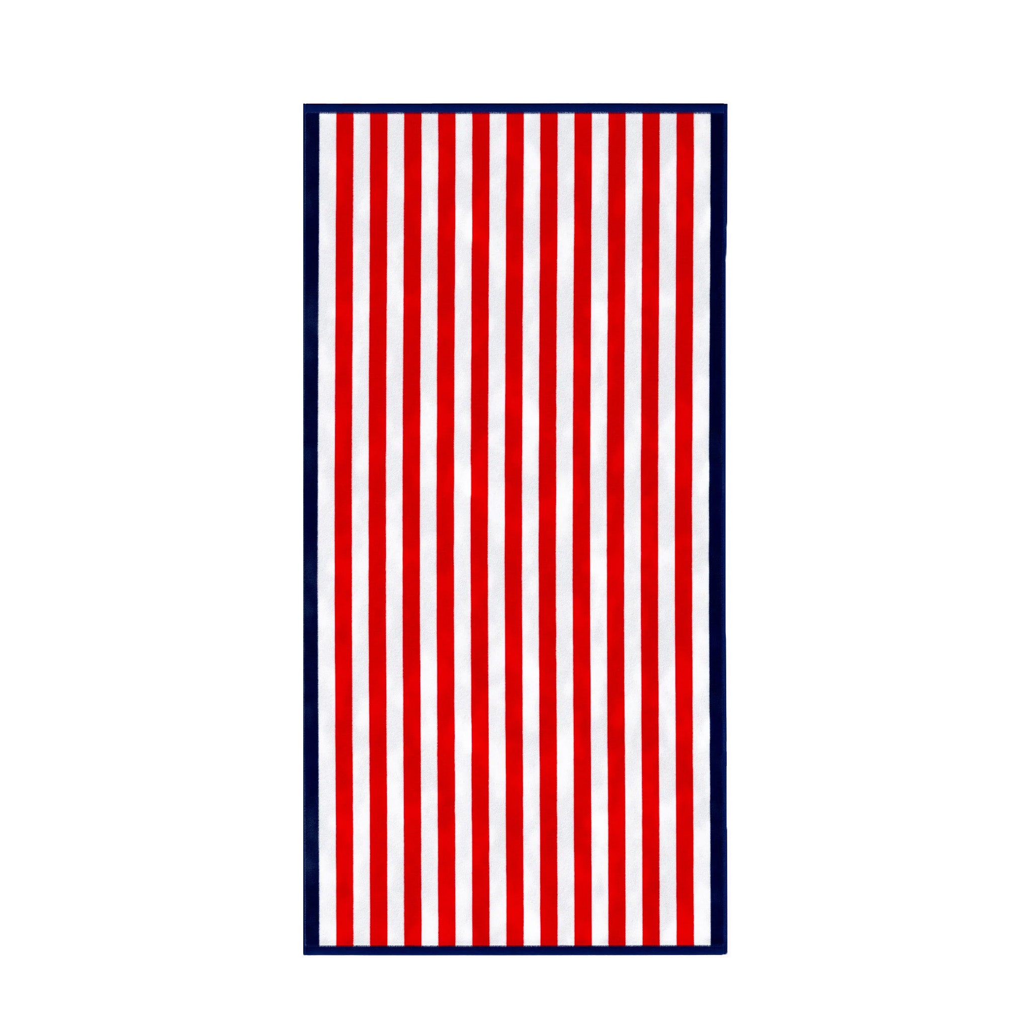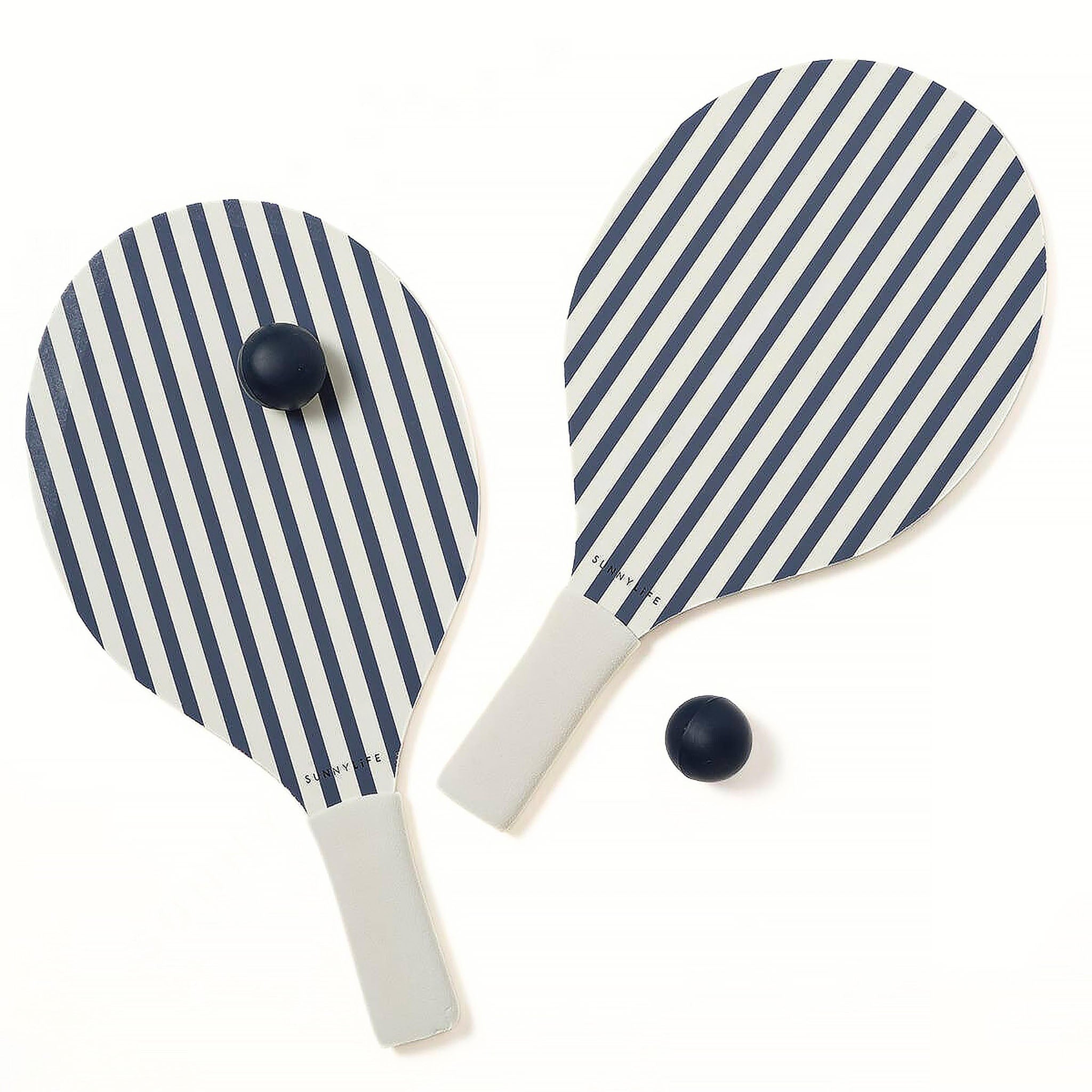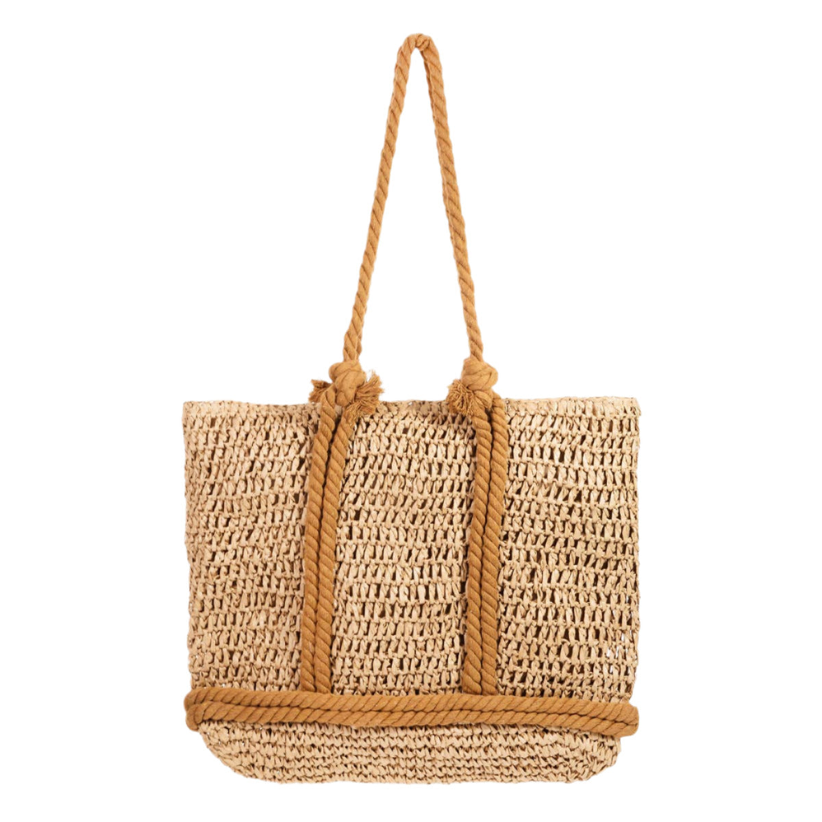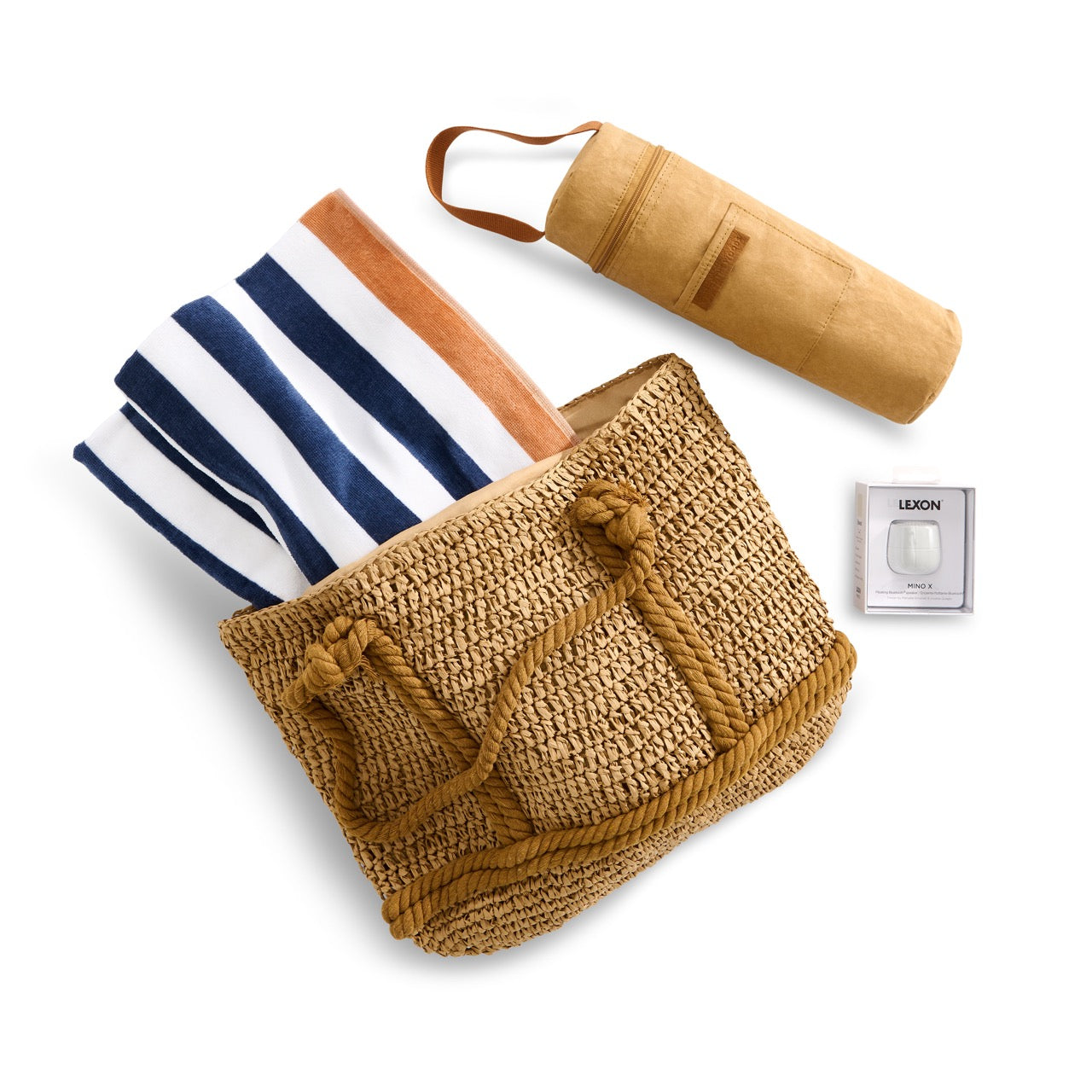 A beige and blue striped lunch poche with a removable insulated insert and a detachable long strap.