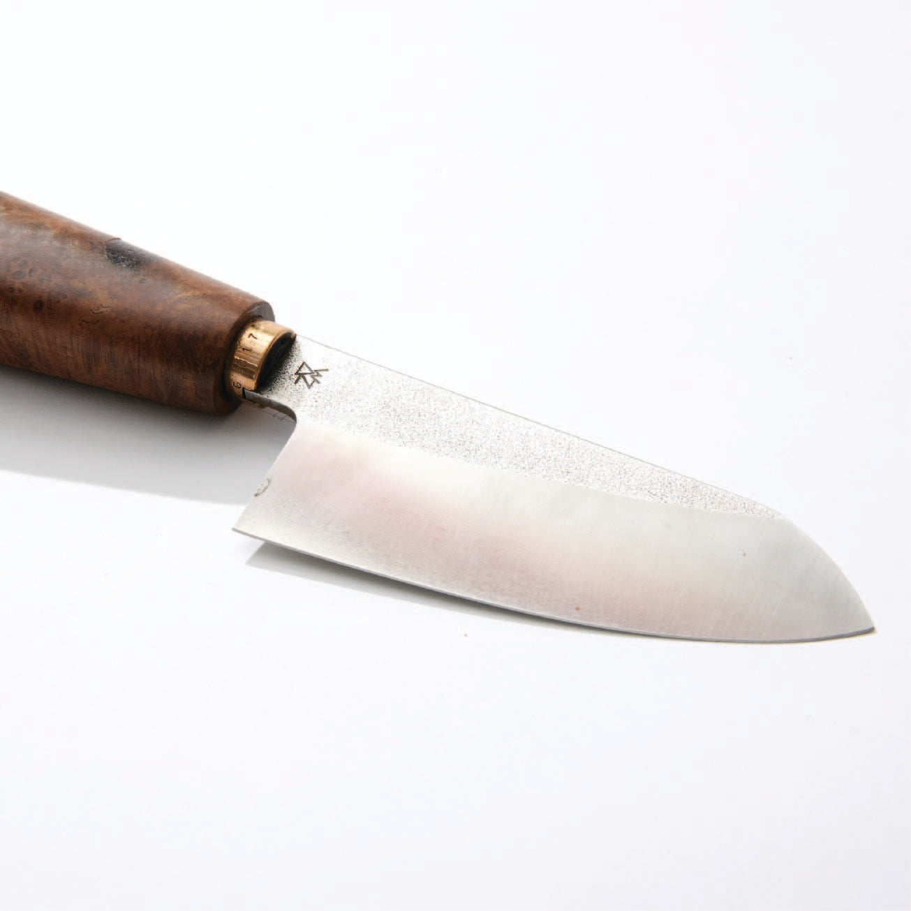 The handle of this knife is a true work of art. Meticulously sculpted from walnut burl, it is not only visually stunning but also ergonomically designed to provide a comfortable grip for extended use. Its stabilized construction ensures longevity and offers excellent balance for maximum control.