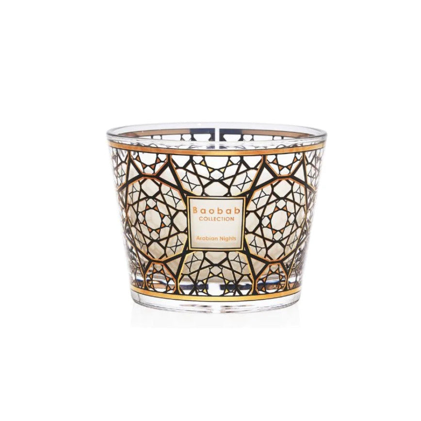 The Arabian Nights scented candle takes us to the mysterious world of the Middle East. With glass screen-printed with 9 carat gold, it draws its inspiration from the famous moucharabieh, open work motifs found in Arab architecture. Through the glass, the flame appears as it creates an enveloping shadow.