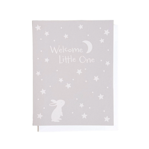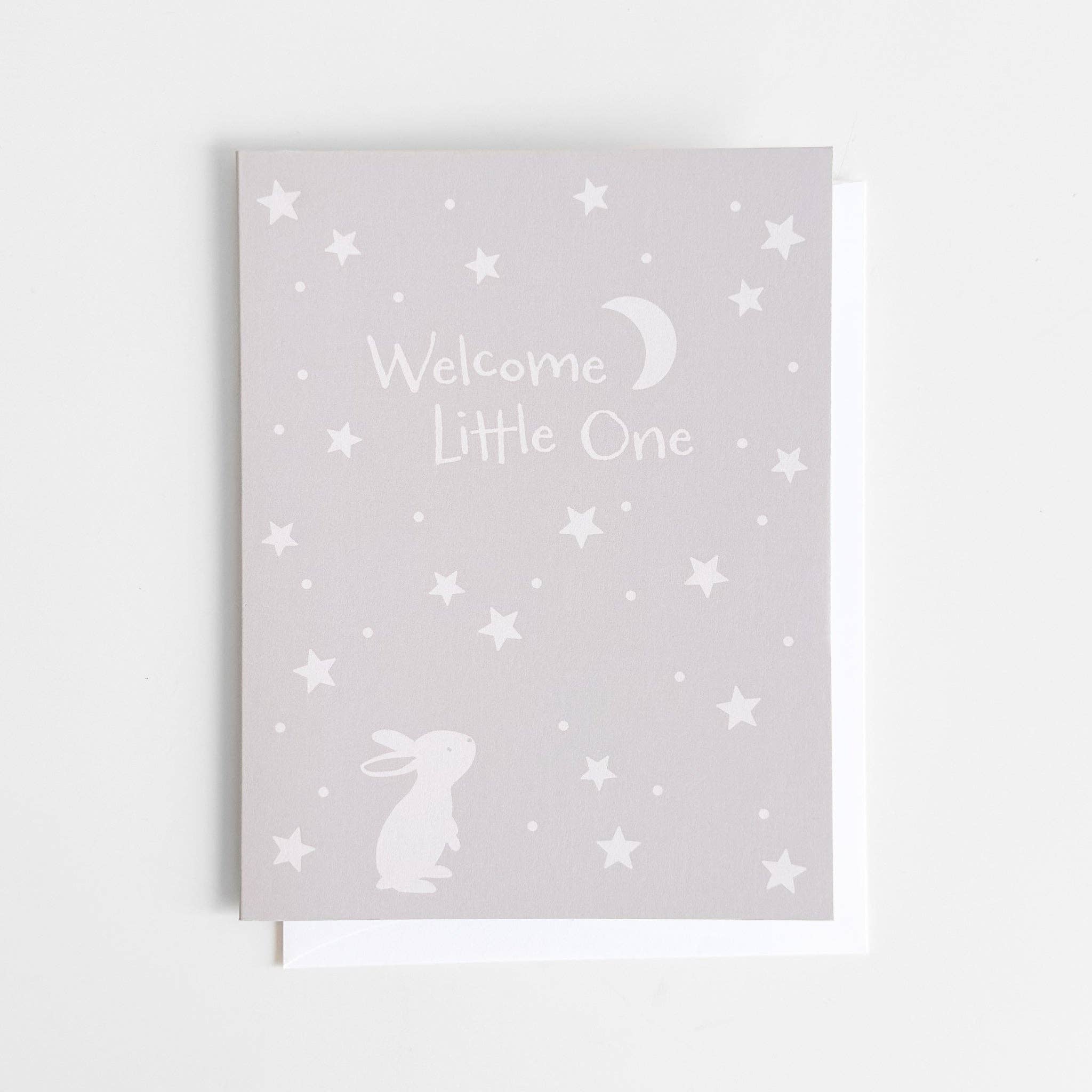 A soft and sweet way to welcome a new arrival. Featuring a gentle illustration of a bunny under a starry sky, this card pairs beautifully with a blanket, hat, or any newborn gift. Printed on natural white paper and blank inside for your message.