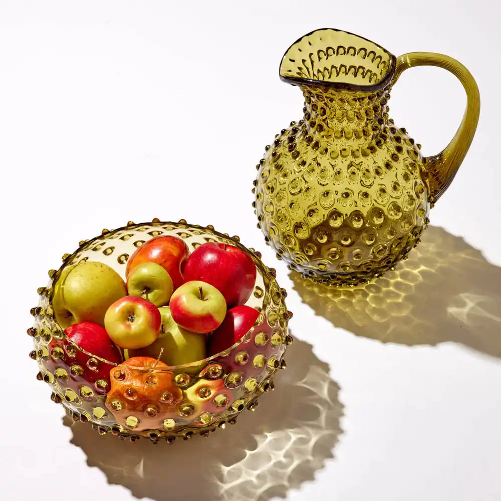 Whether used as a vase for your flowers or as a water jug, this Bonsai Green Pitcher will liven up any space and will become a great decoration as well as a beautiful functional piece of glassware. It features aesthetic hobnail décor which was popularized by Mr. Fenton in the first half of the 20th century. The elegant tapered handle gives a comfortable grip on the jug, while the hand-shaped ice lip restrains wayward ice cubes and its refined opening allows easy cleaning.