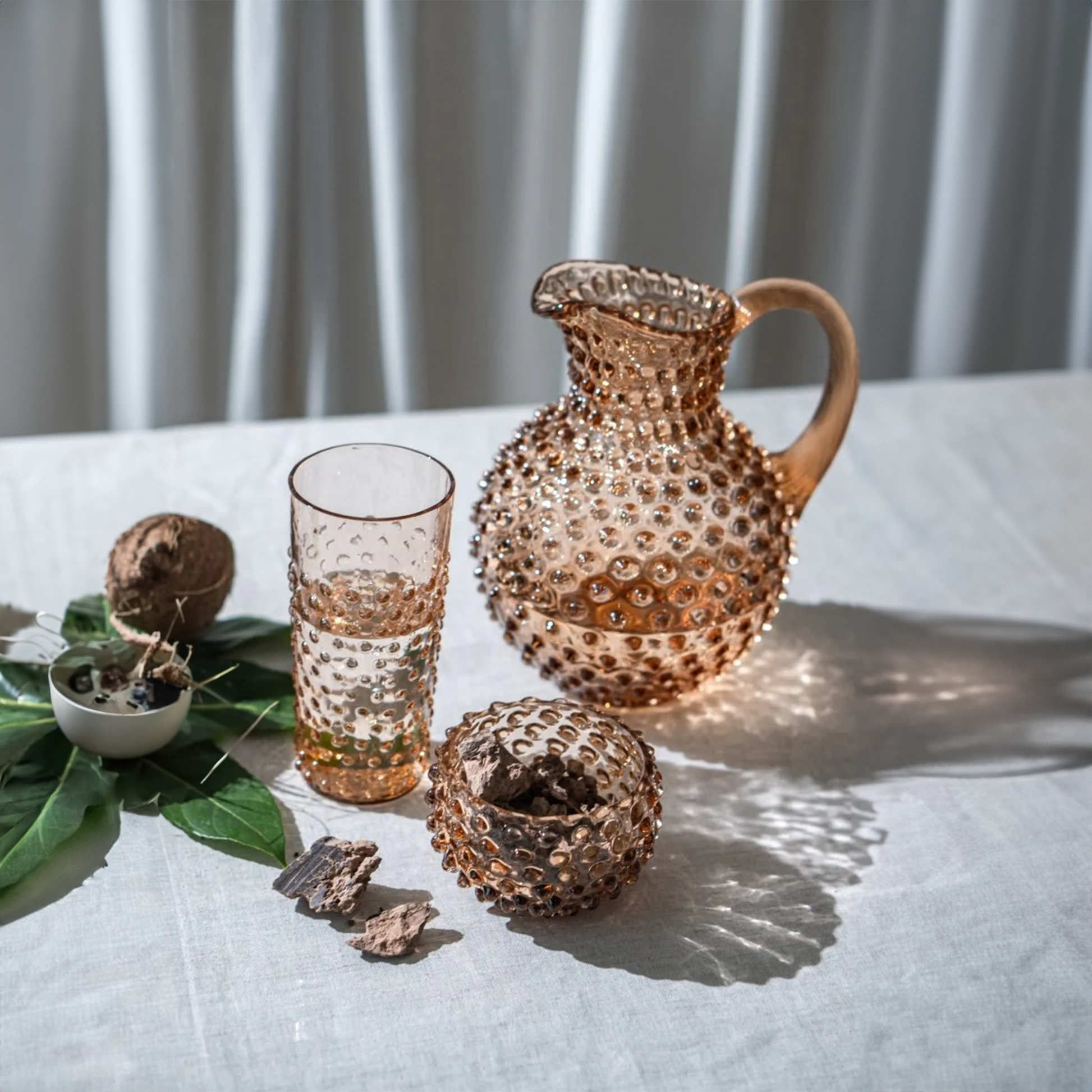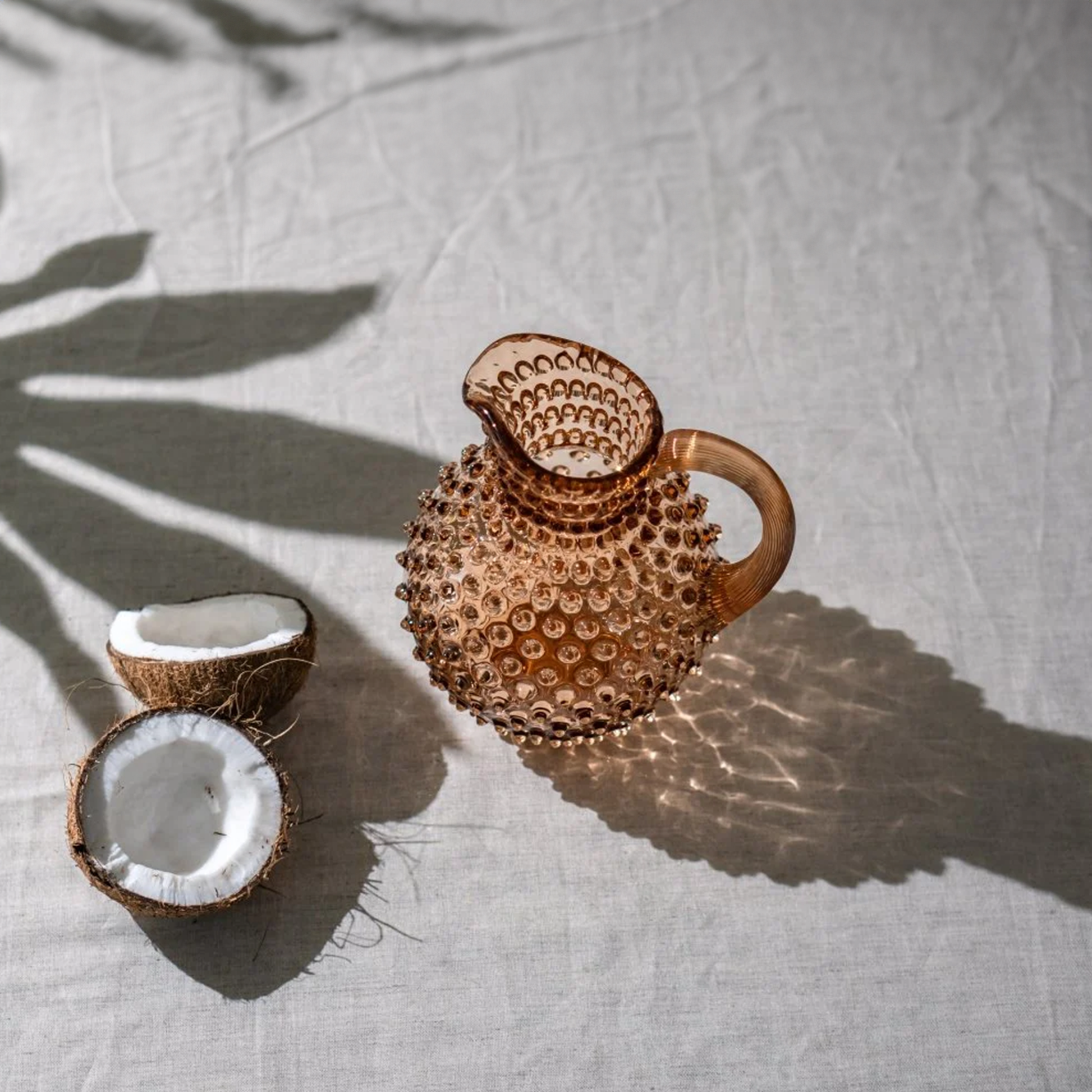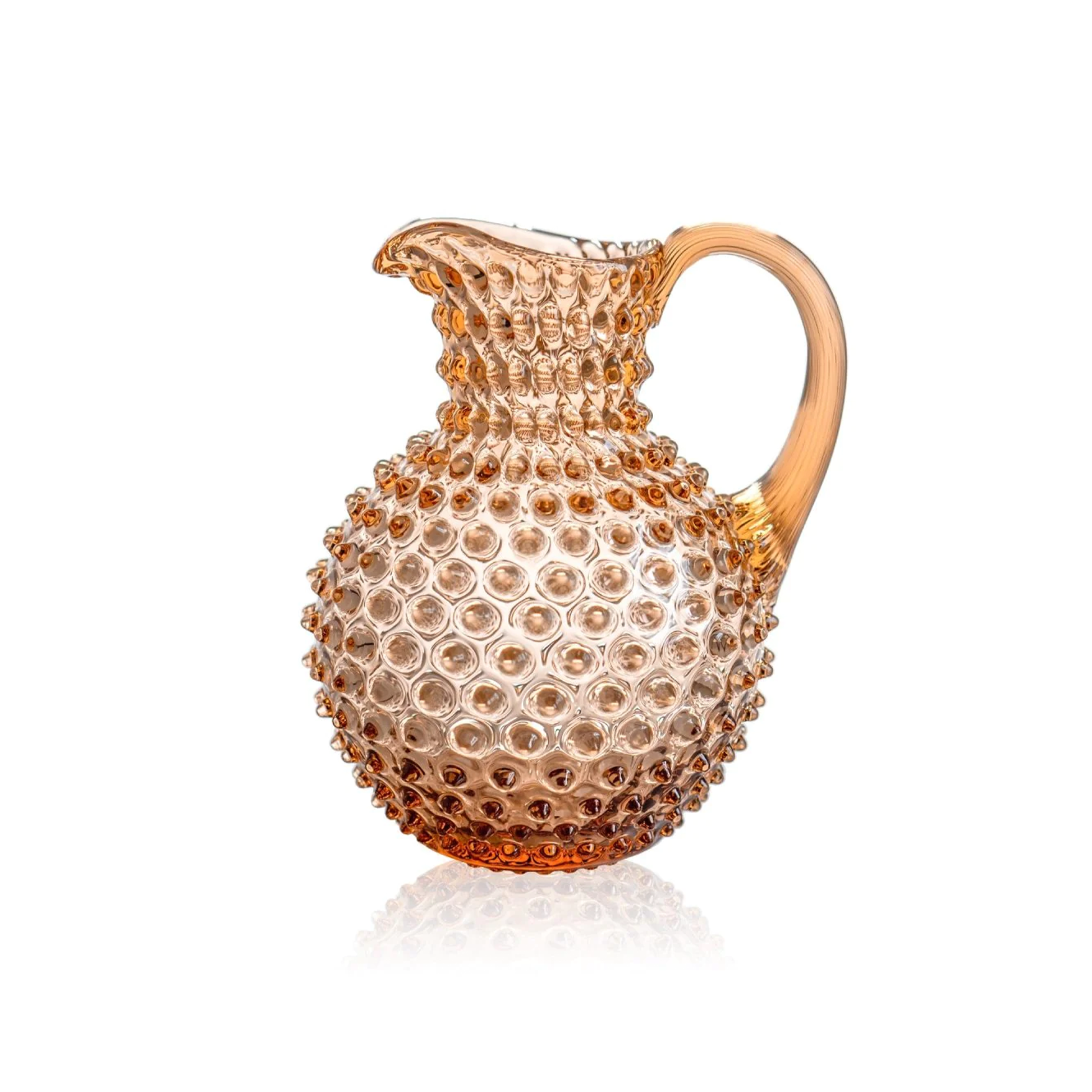 Whether used as a vase for your flowers or as a water jug, this Bronze Pitcher will liven up any space and will become a great decoration as well as a beautiful functional piece of glassware. It features aesthetic hobnail décor which was popularized by Mr. Fenton in the first half of the 20th century. The elegant tapered handle gives a comfortable grip on the jug, while the hand-shaped ice lip restrains wayward ice cubes and its refined opening allows easy cleaning.