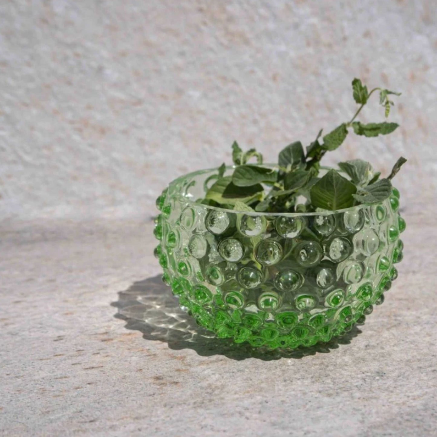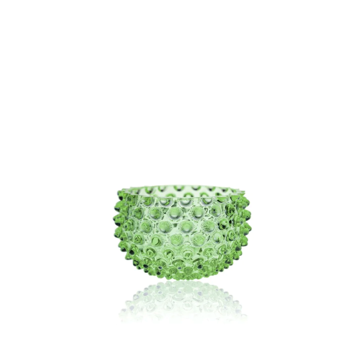 The unique shape and tint of the Light Green Small Bowl make this a truly stunning centre piece with its highly curved sides and modern hobnail design.  Its ability to capture and reflect light beautifully lends itself to creating stunning decor features or simply lighting up the dinner table with a touch of class.
