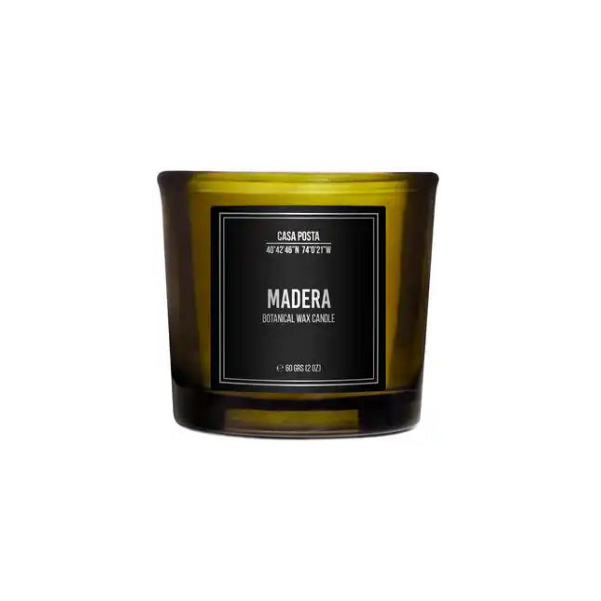A green glass candle vessel with a black label that reads 'MADERA', with a flat weave cotton wick visible at the top.