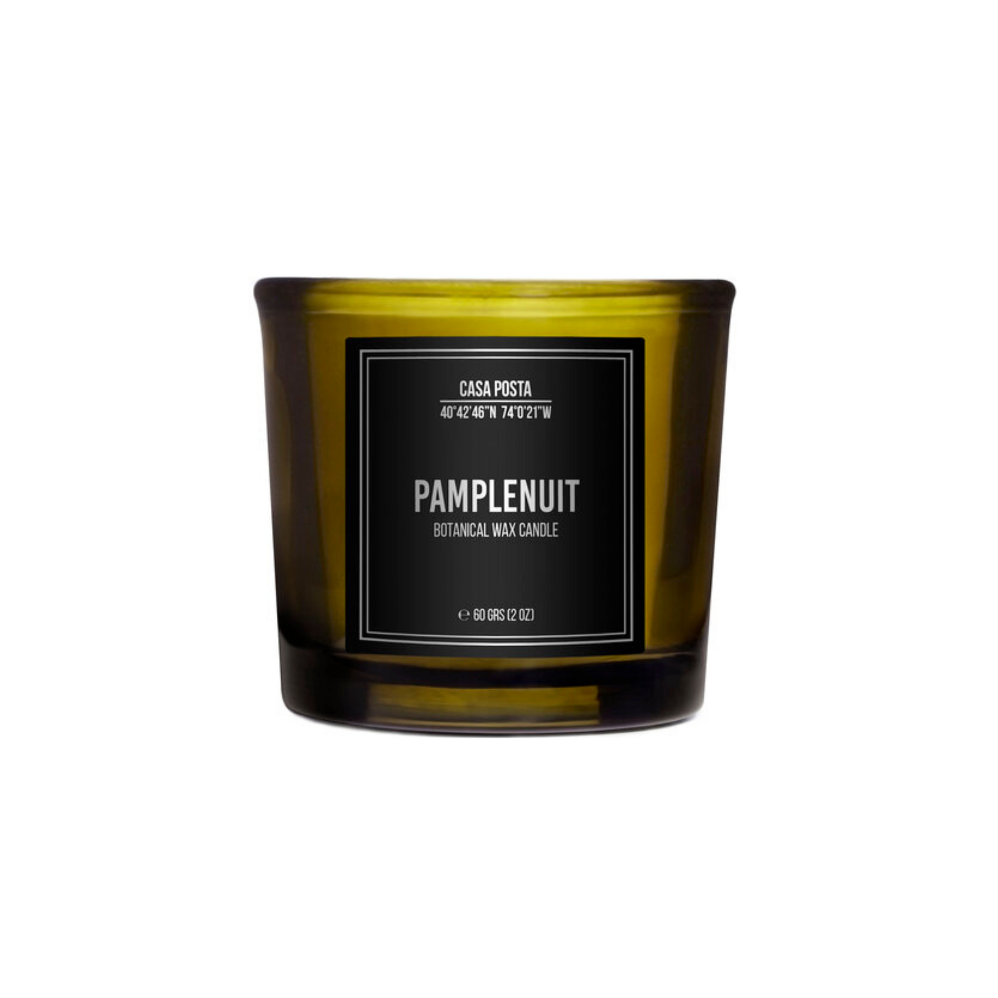A green glass votive candle holder with a black label that reads 'PAMPLENUIT SCENTED WAX CANDLE'.