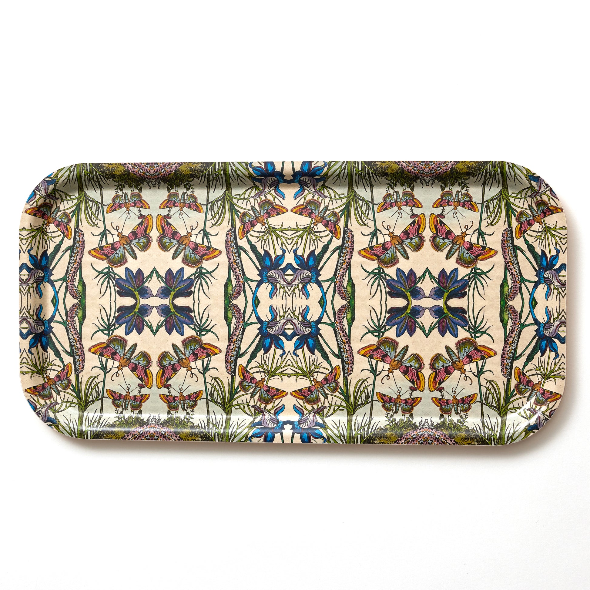 A unique kaleidoscope of flowers, butterflies and inquisitive bugs adorn this natural birch wood tray. Enjoy the wonder of Prairie flowers, wildlife and contemporary design - with an edgy repetitive twist.