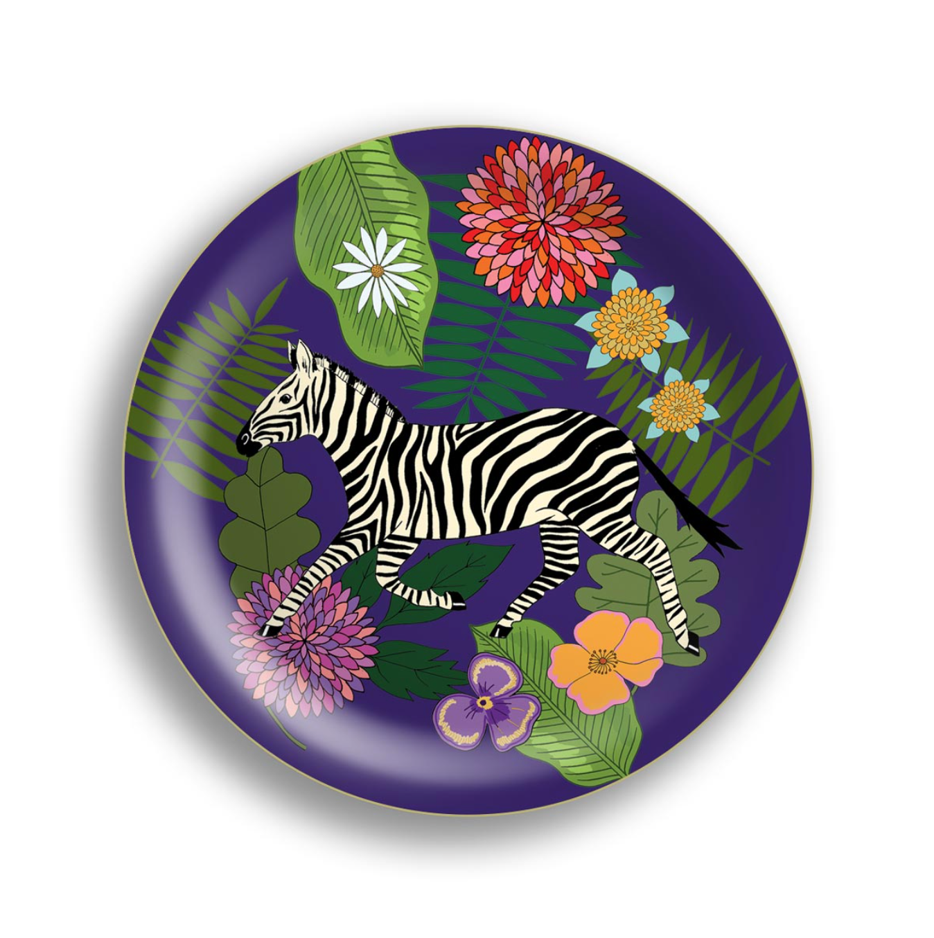 A collaboration with graphic artist and designer, Karon Mabon, this beautiful SAVANNA BIRCH WOOD ROUND TRAY really is a work of art. This African Savannah scene features a striking tiger and lively young zebra, visually contrasted with a jungle-esqe bouquet of classic and exotic fruits and flowers. With its rich deep purple background, this round birch wood tray is as beautiful as it is eye-catching. The perfect visual adventure to brighten up your day. Made in Sweden, this jungle sensation is designed to be daring and different.