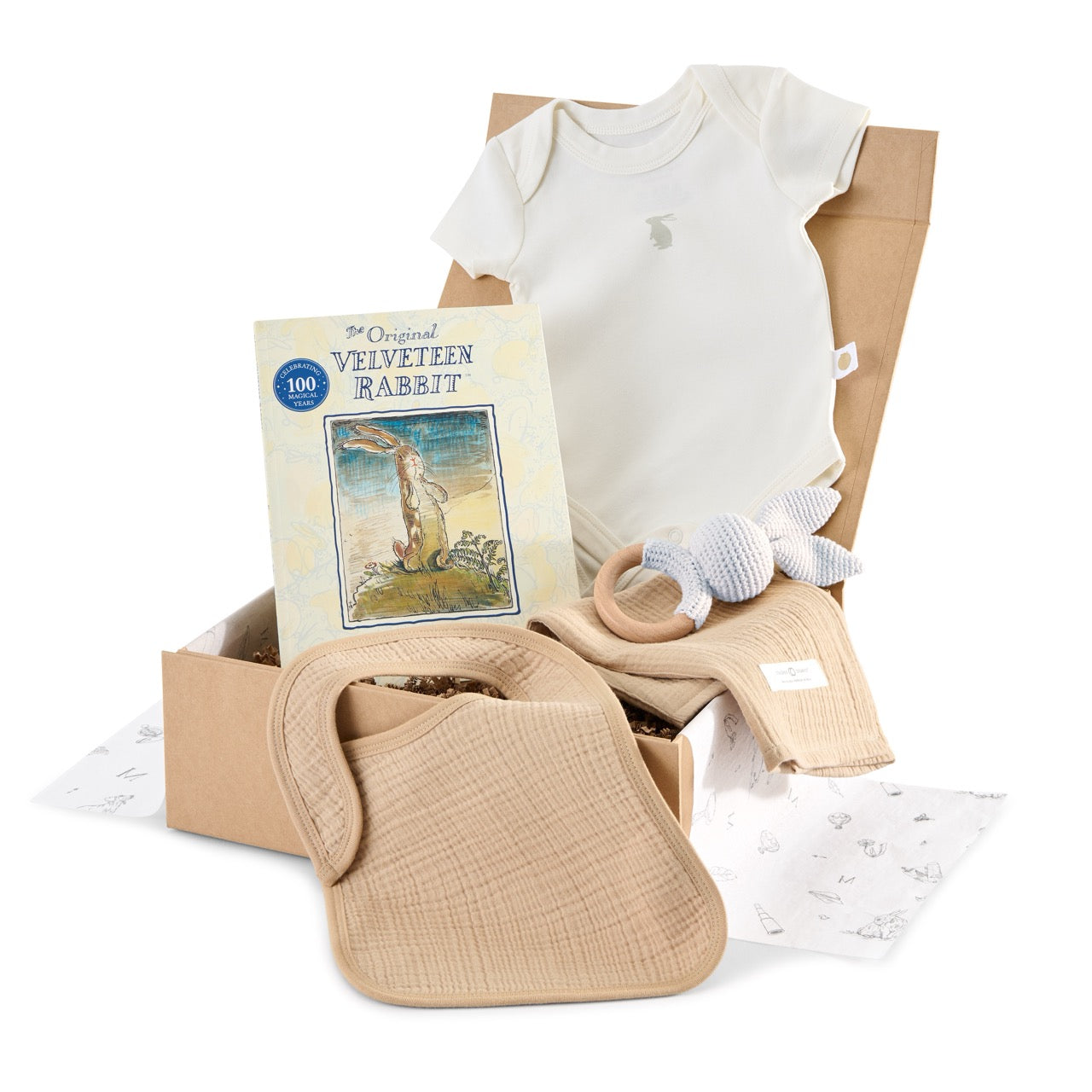 A tender gift box that brings the classic tale of love and transformation to life. Centered around The Velveteen Rabbit, this collection includes a gentle blend of soft textures and timeless charm. From the natural cotton bunny teether to the neutral-toned onesie and bib, each piece invites warmth and quiet comfort. A thoughtful way to say “welcome” that feels grounded, elegant, and just a little bit nostalgic.